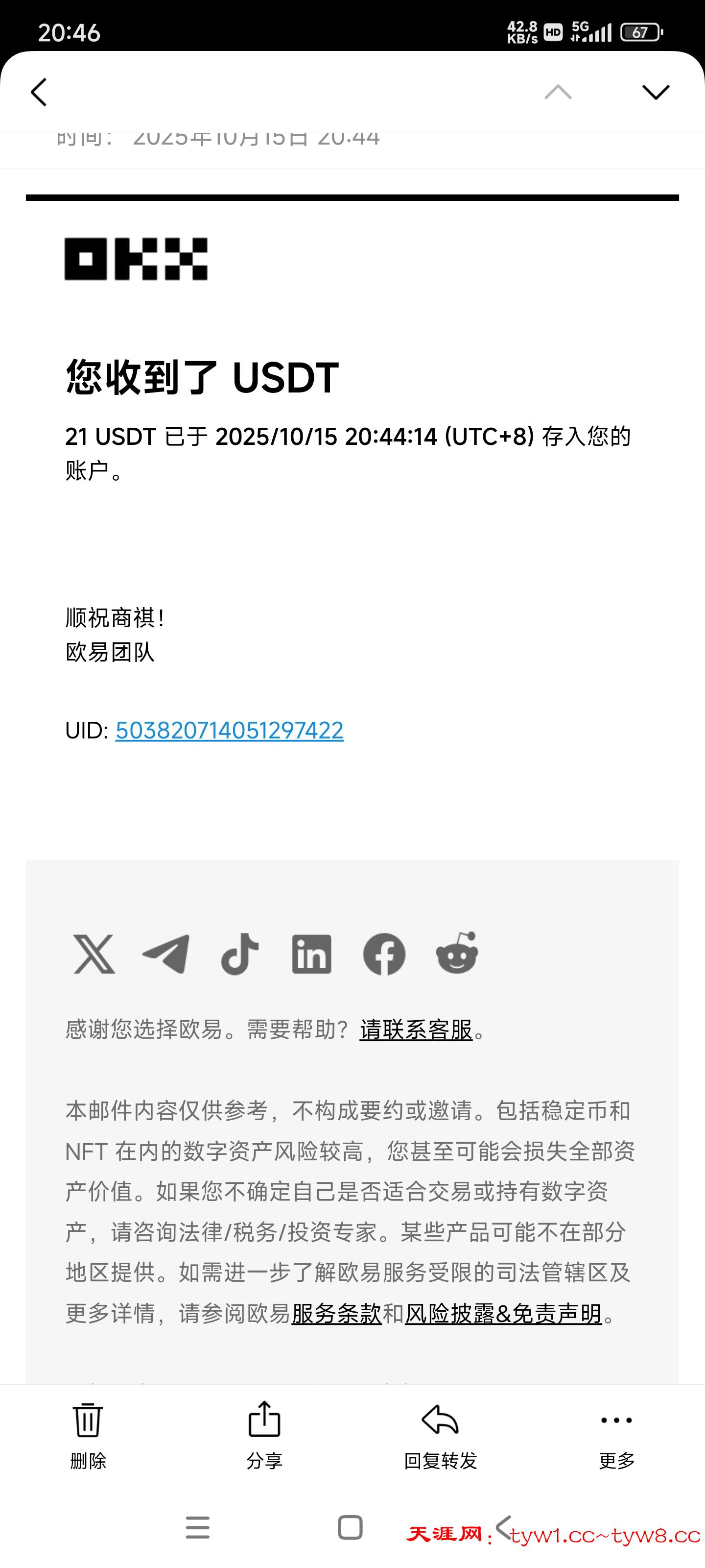 10号左右注册连续存款三天 也就1100元今天申请周常驻以为有38元。沈复叫我发地址我以为是家庭地址 ip地址 后面发了 火币地址 收到21u 感动哭了