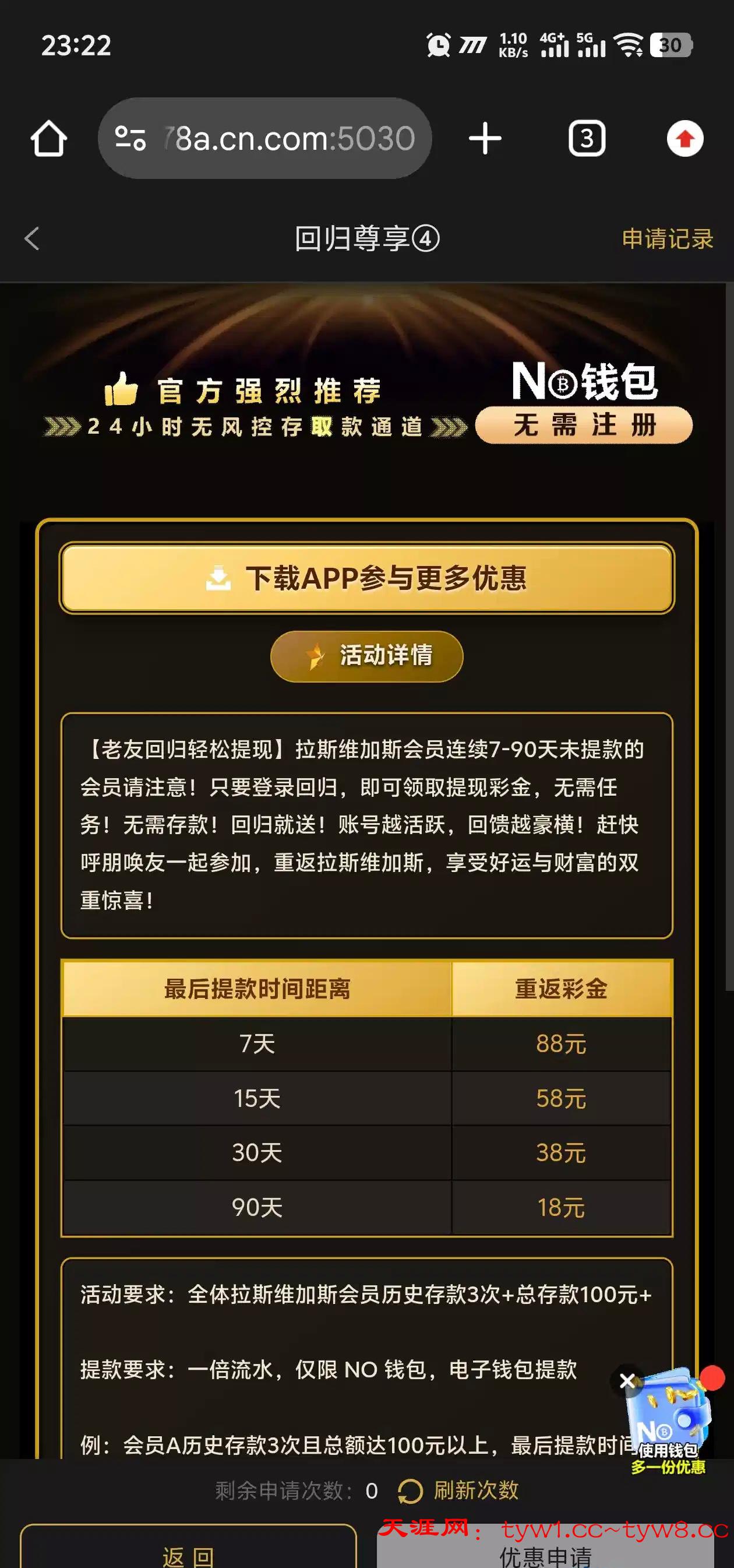 充值过的去吧,没充值过的估计没有,优惠回归那里还有最后一笔提现回归彩金